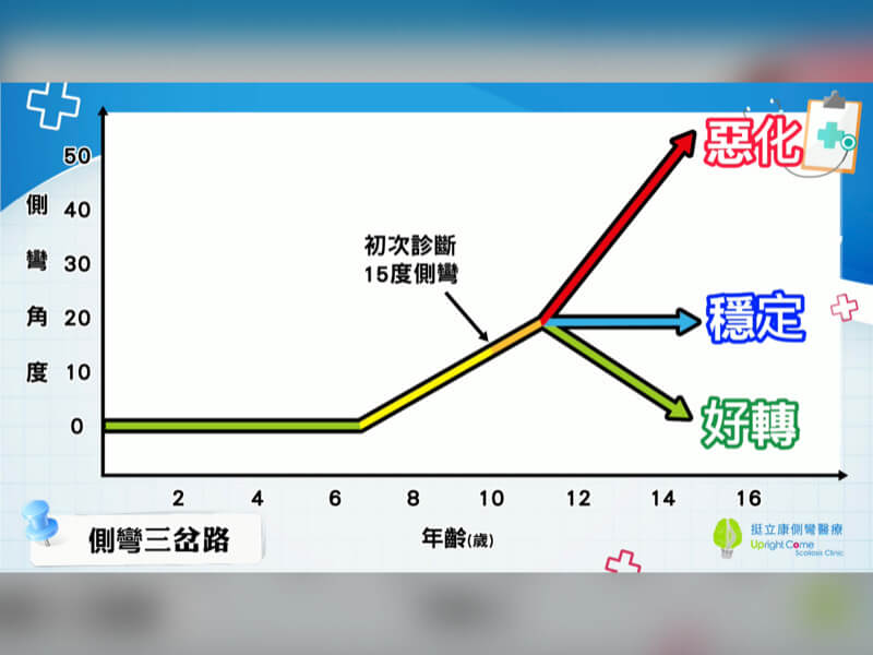 如果在孩子快速成長期,發現側彎約角度15度上下時,我們是無法知道孩子的側彎,是會走三岔路的哪一條路?但如果一發現就是 30 度以上,就幾乎可以確定孩子的側彎就是惡化型的案例。