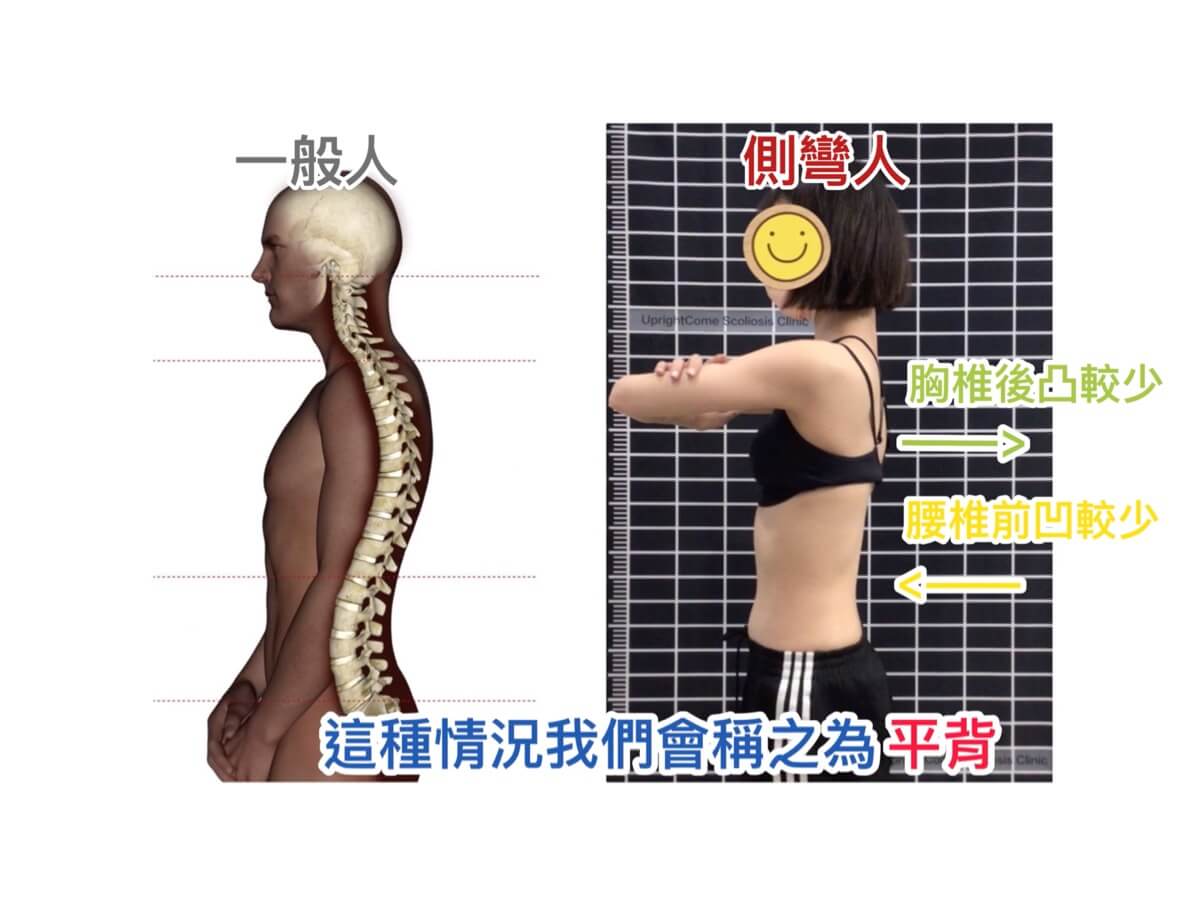 其實,大多數的側彎患者多為平背而不是駝背,一般人側面的生理曲線是 頸椎會往前、胸椎往後、腰椎則往前。而側彎患者常在胸椎的地方相對於一般人往後的幅度較少,這種情形我們會稱之為平背。