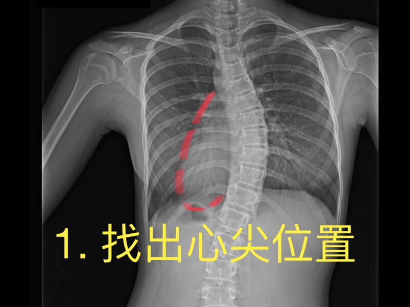 心尖是一個非常重要的判讀位置,我們在看X光片的時候,第一點我們要先找出心尖的位置在哪裡、心臟的位置在哪裡?來快速辨別他的X光的正反面。心臟的位置,多數會是落在左側的,那也因為它落在左側,所以就可以很明確的知道,這邊是左邊,另一邊會是右邊,這是一個很容易快速找出來的一個方法喔。