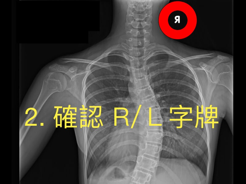 看 X 光片的時候,除了可以很清楚地知道有脊椎側彎之外,那到底是向右側彎,還是向左側彎呢?利用下面四招,快速找出 X 光正反面,就可以進而知道脊柱是向哪一邊彎了。