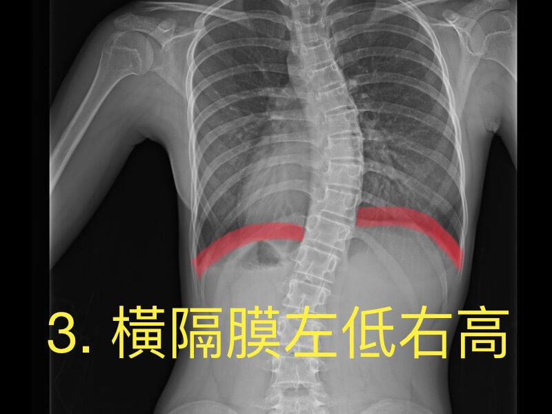 橫膈膜剛好就在肺的下方,其實它並不是等高的,右側橫膈膜其實是相對比較高的,而左側橫膈膜就會比較低,所以看到右高左低,那這就會是他的背面影像囉。