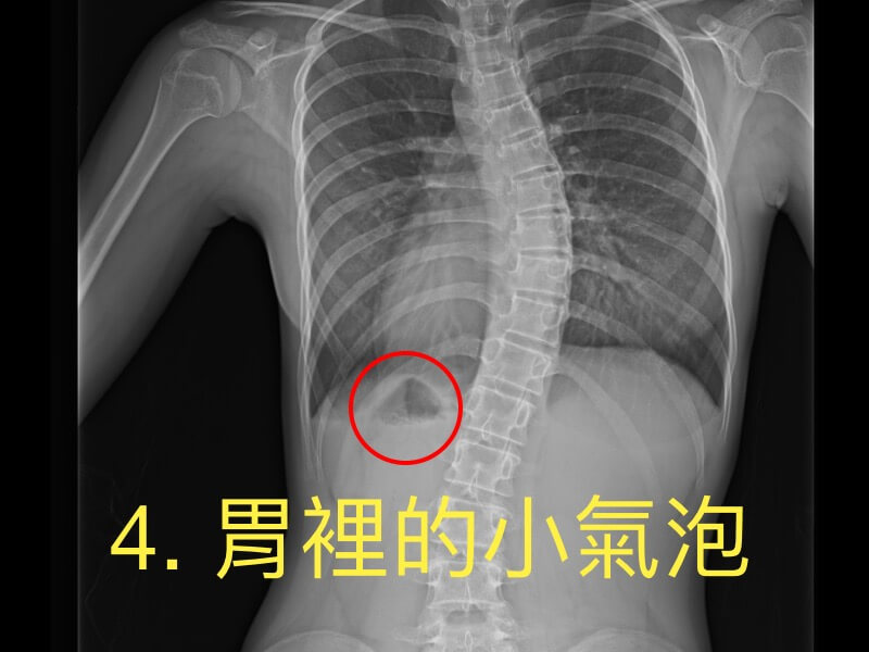 這就會是比較內行的人才會知道囉,心臟的正下方這裡,你有沒有看到這裡有一個圈圈,這空洞其實就是胃的氣泡,而胃正常來講是偏左側的,那我們就可以知道,左側在哪一邊,進而可以辨識X光片是正面,還是背面的影像喔。 。