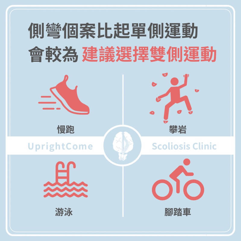 脊椎側彎個案在選擇運動時,相對於單側運動,會比較建議雙側運動喔!以下推薦幾個較適合脊椎側彎患者執行的有氧運動。