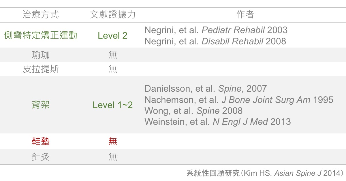 從一篇 2014 年的系統性回顧研究,統整過去至今發表的國際文獻,發現瑜珈、皮拉提斯、鞋墊、針灸對於青少年原發性脊椎側彎的治療效果,文獻證據不足、成效存疑!!!