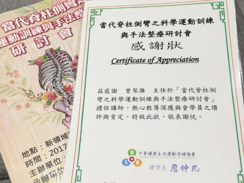- International certificate of SEAS technique from Italy (Scientific Exercise Approach for Scoliosis by Michele Romano, Taichung), 2017