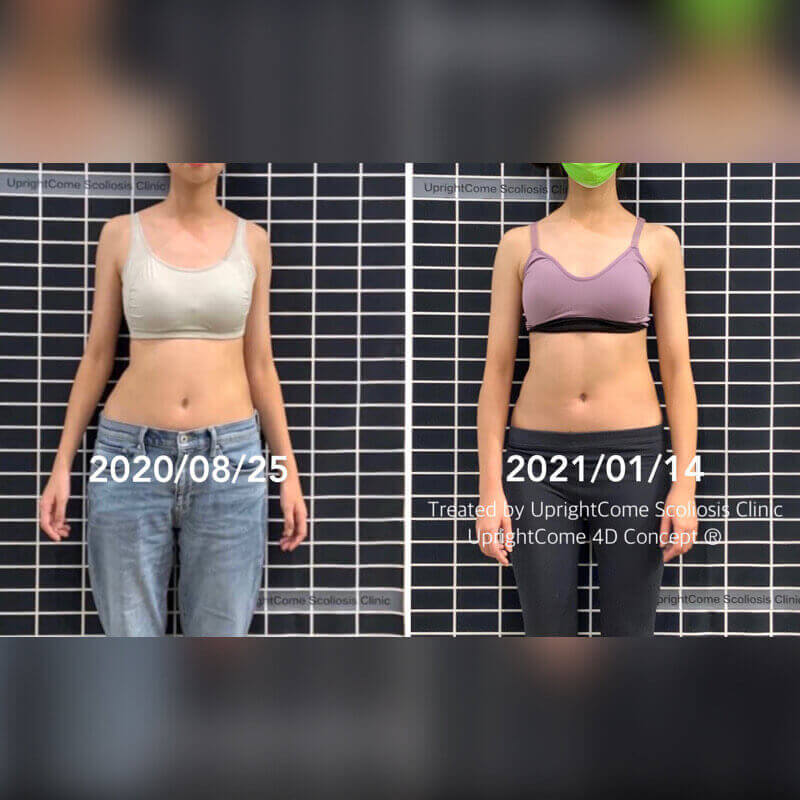 因為朋友的推薦,女孩來到挺立康,初診時透過主任專業諮詢評估,進而了解自己的脊椎側彎,也明白了原先所穿戴的背架並不適合自己,在挺立康開始學習適合自己的側彎矯正運動。