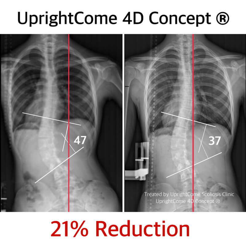 這是一位 16 歲腰椎重度脊椎側彎女孩,經過挺立康 4D 側彎治療後,改善 21 % ,從重度降為不用開刀的範圍。
