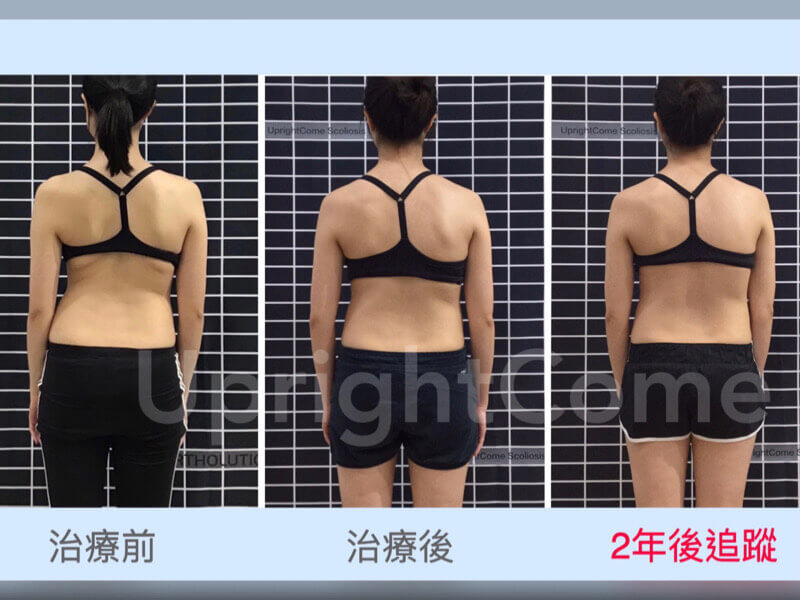 療程結束2 年後回診追蹤,體態依然保持對稱!初診時患者跟我們說:「曾經每個禮拜都去推拿,推了一年多都沒有用,本來已經預約好要開刀,但男友在網路上找到挺立康,想再給自己最後一次機會。」現在的她,曾經的腰痠沒有了,體態也保持對稱。