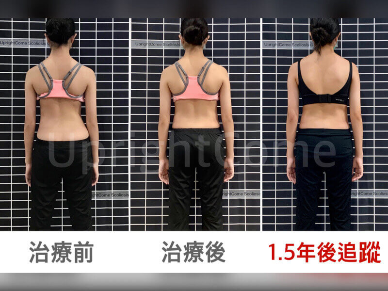 這是ㄧ位來自新竹 15 歲胸腰側彎女孩,還記得女孩當初在第三次治療,體態就有明顯的改變!療程結束後持續追蹤 1 年多,體態也依然保持良好,近期的 X 光顯示胸腰度數改善 28 %,女孩依然勤於練習,將矯正觀念深深烙印在心中!