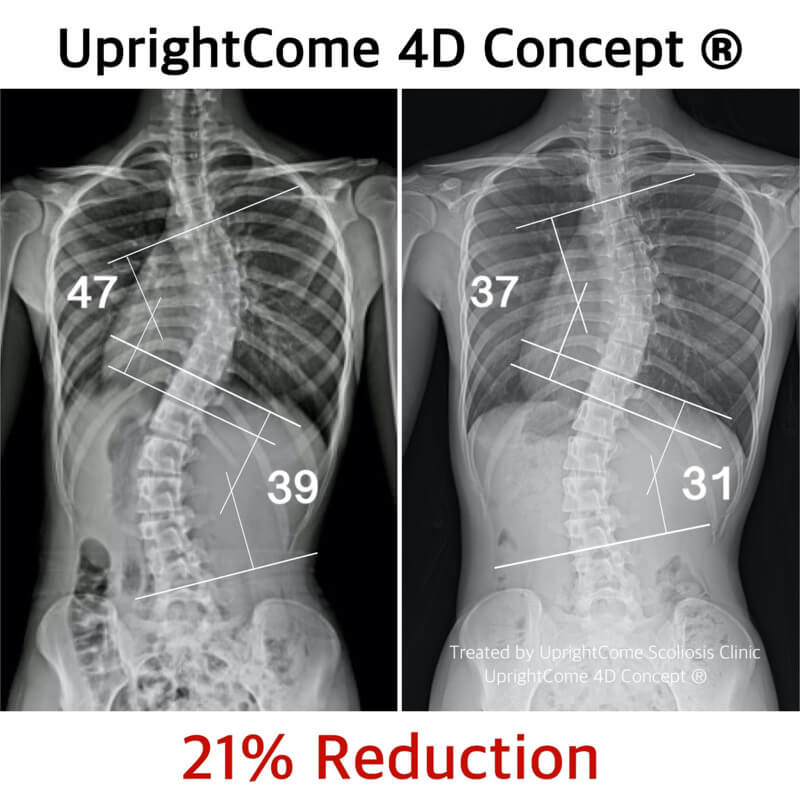 這是一位 15 歲 S 型重度側彎女孩,就讀高中數理資優班的她,兼顧繁重課業與居家矯正動作,除了完成,女孩追求的是完美,經過挺立康4D專屬治療系統治療 與追蹤,胸椎側彎角度從 47 度改善至37 度,腰椎側彎角度從 39 度改善至31 度,側彎角度從原本的重度改善到不用開刀的範圍,家人開心著跟我們說:「這段期間的努力都值得了」。