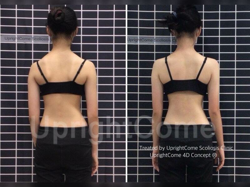 這是一位 24 度胸腰椎側彎的 13 歲女孩,因為一次心臟檢查發現脊椎側彎,進而察覺到自己的體態不對稱,久坐還會有腰酸背痛的困擾 熱愛演奏小提琴的她,擔心演奏姿勢會導致脊椎側彎惡化,也希望能夠美美的踏上舞台,決定積極進行治療,在挺立康4D初階療程後,女孩與媽媽驚呼:「 哇~體態真的變好了! 」
