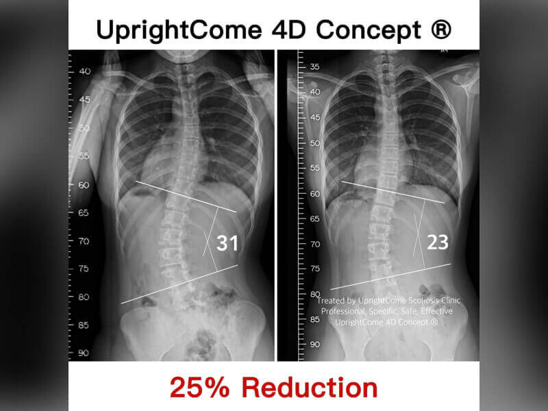 女孩某天手叉腰時,感覺腰部一凸一凹的,而且左腰處常常酸痛影響了生活,經醫院檢查後發現有脊椎側彎,在家長的陪同下,來接受治療,經過挺立康4D專屬治療後: