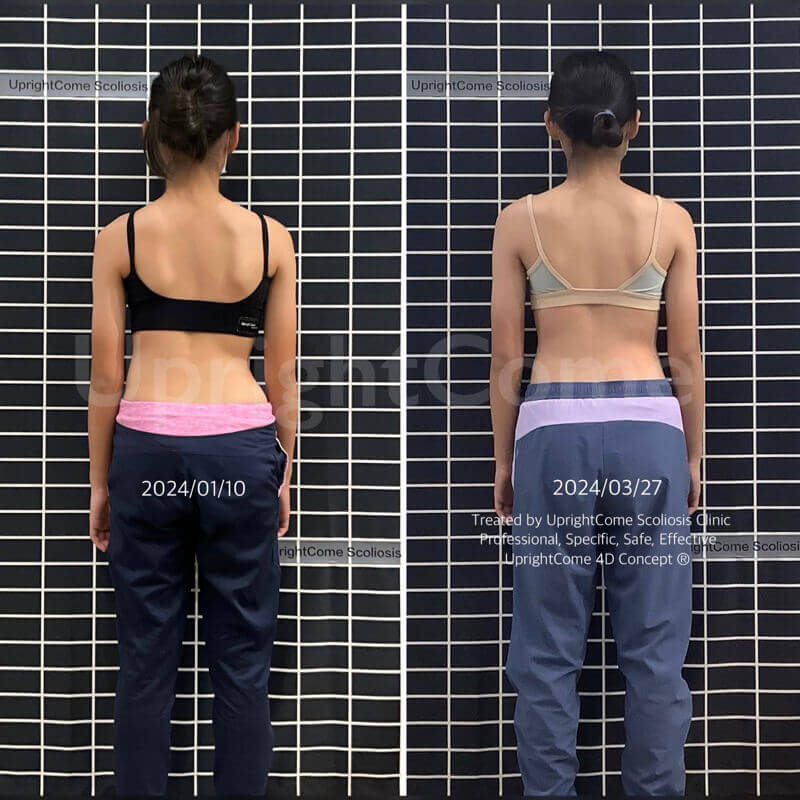 一位 11 歲 35 度 S 型側彎女孩,在她某天洗澡的時候,發現自己的腰線左右不對稱,帶去醫院檢查後發現了側彎,正值高惡化風險的她,為了防止側彎持續惡化,在家人的陪同下前來挺立康治療,經『挺立康4D專屬治療』後